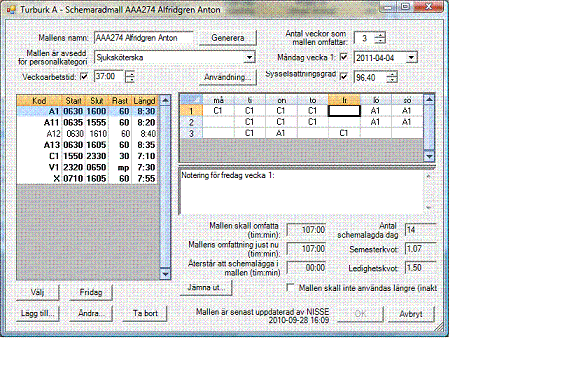Timetool Boka 5.0 har fullt stöd för traditionell schemaläggning.En schemamall är ett rullande schema som nödvändigtvis inte är knuten till en person. Schemamallen används för att registrera fasta scheman. Då man kopplar personer till en plan kan man ange att schemat skall vara lika med en schemamall. Det går bra att blanda schemamallar med vanliga bokade scheman. En schemarad registrerad som ett önskeschema kan göras om till en schemamall.Läs mera:SchemamallarTimetool Boka 5.0